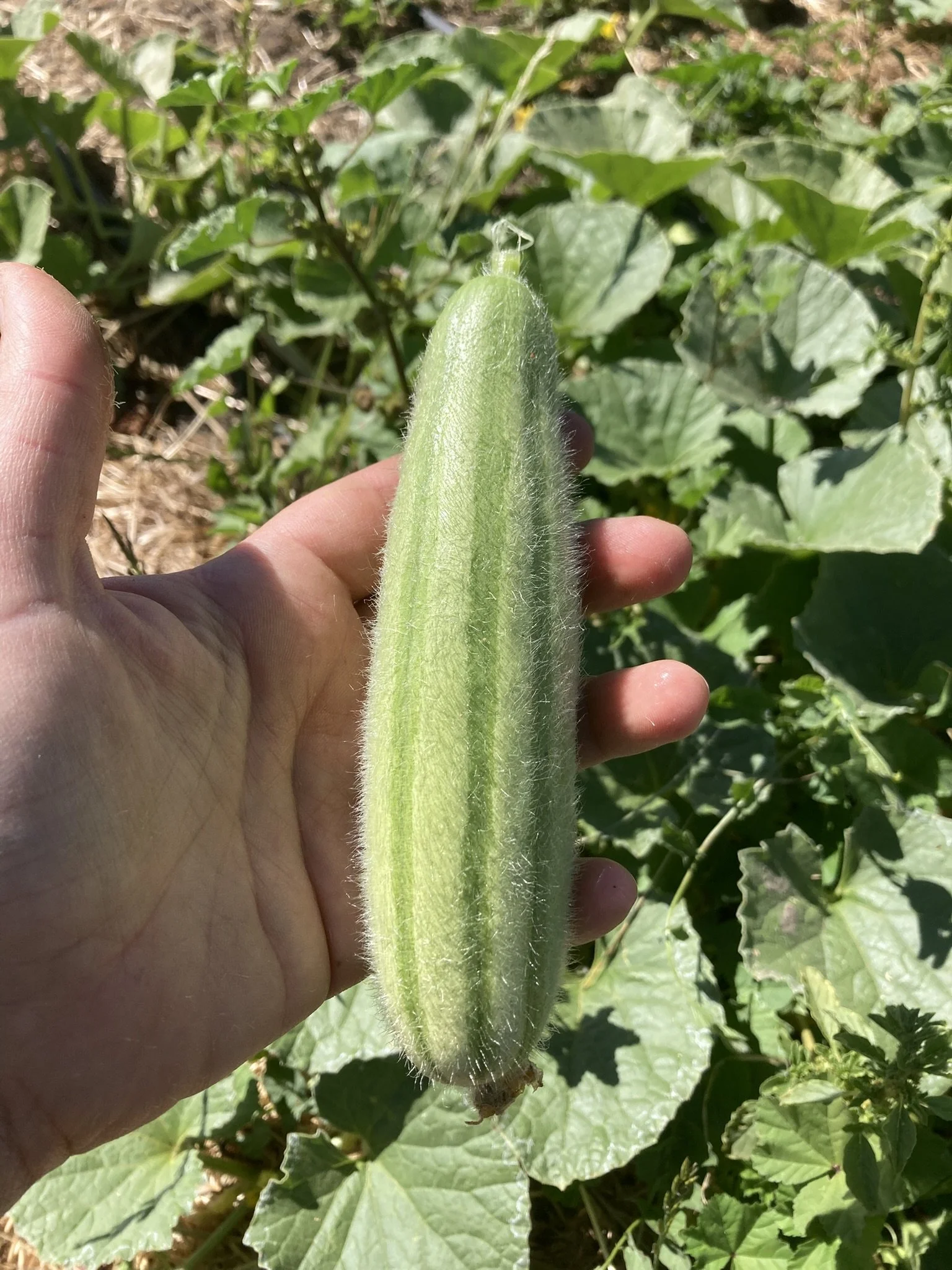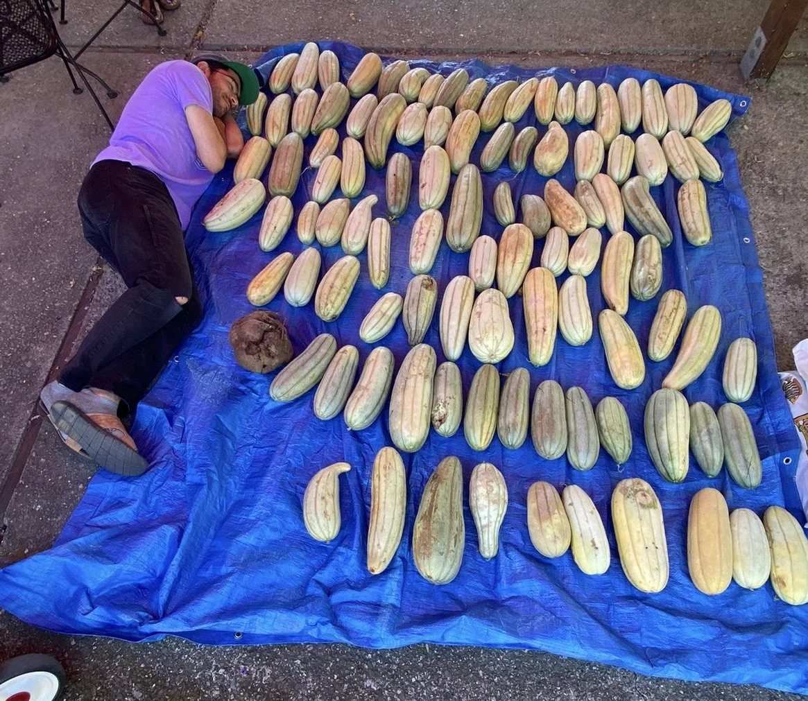 Select the fruits and/or plants that you would like to save for seed and leave on the plant for as long as possible. The fruits can get fairly large, about 18-24 inches long (see photo on bottom right). Before the plant has died or before the fruit starts rotting, harvest the fruit and let them sit for about a week before processing for seed.