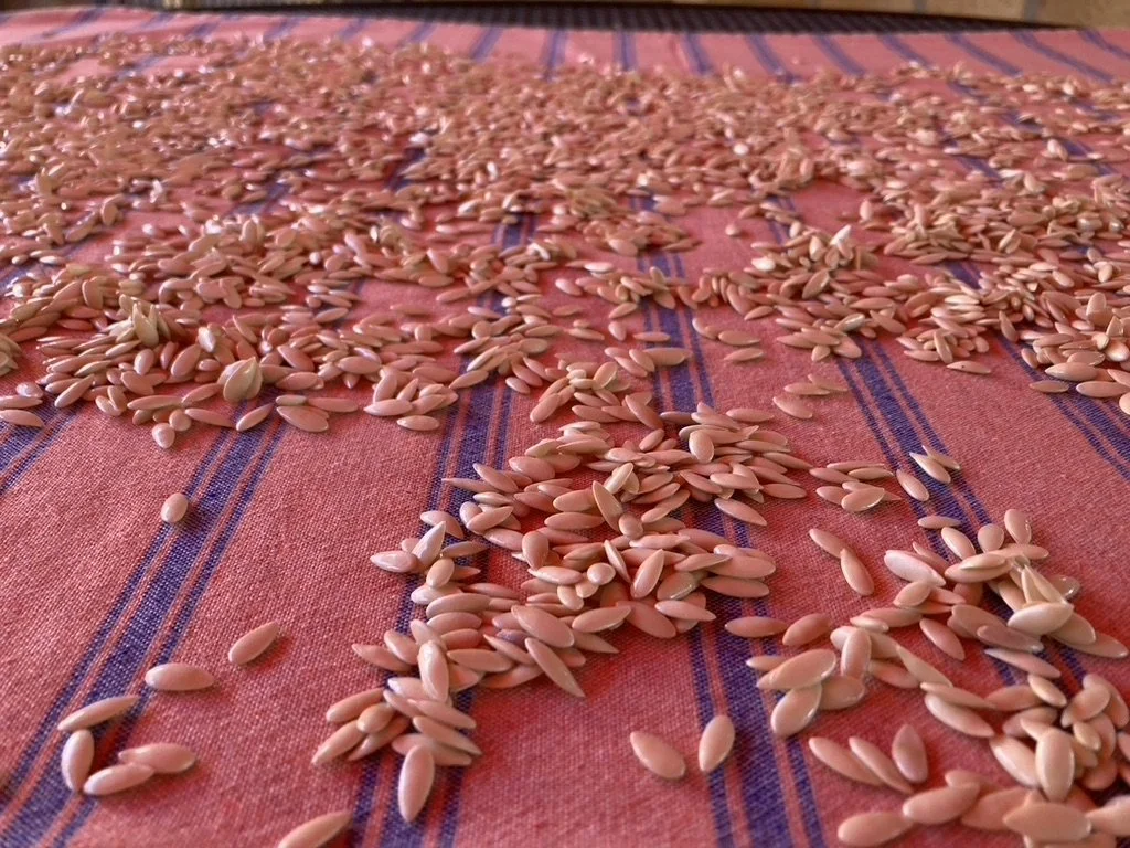 Fakous seed is wet processed like cucumber seeds. Scoop out seeds into a bucket and fill with water. You want to have less than a quarter of the bucket filled with seed and the rest filled with water. Let that sit for 3-5 days, depending on the temperatures outside (if hotter, they can sit for a shorter period of time) and be sure to stir or spray with water each day. This process helps separate the seeds from the flesh and helps break down the outer coating around the seeds. Viable, healthy seeds are heavier and will sink to the bottom while non viable seeds are lighter and will float to the top. When the wet fermentation process is done, pour out water from the bucket, careful to not pour out the heavier seeds at the bottom. Keep rinsing/decanting the seeds until the water runs clear. Then pour the seeds out into a strainer and spread the seeds over a screen or a blanket and let them completely dry out of direct sunlight.